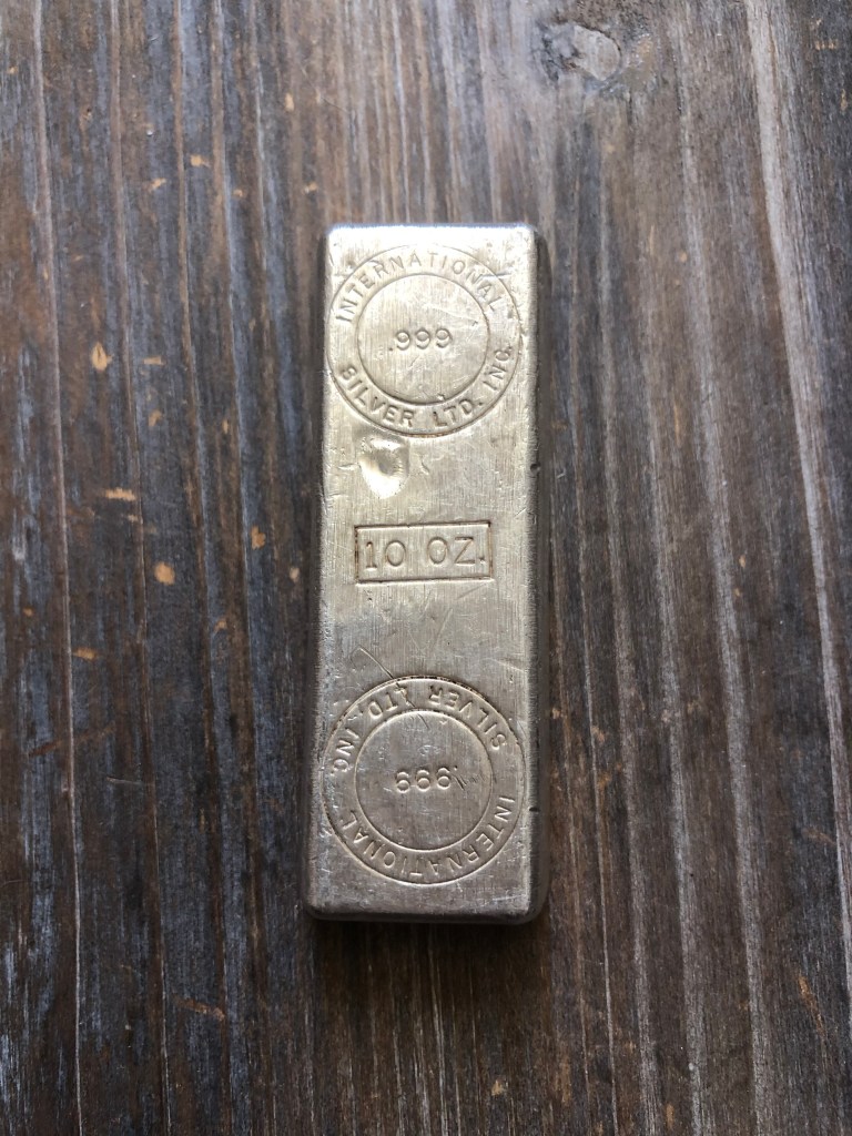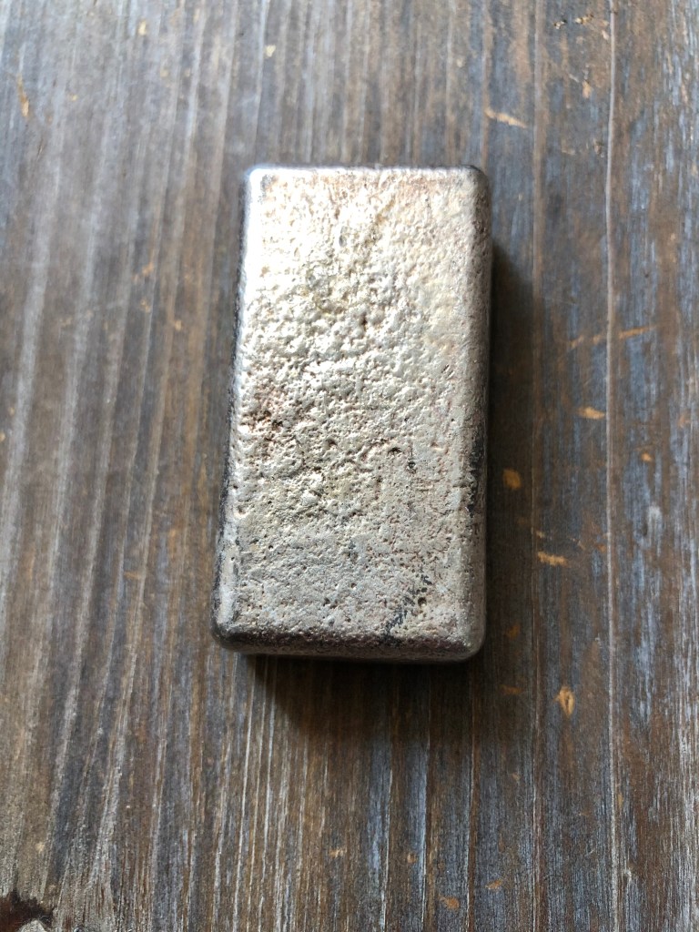 10 oz class with estimated mintage of <500. This pieces has nice patina. Not the weight stamp. It appears the corrected the first stamp appearing to be an “8” with a “7.” Absolutely love this bar.Reverse of 10 oz above.