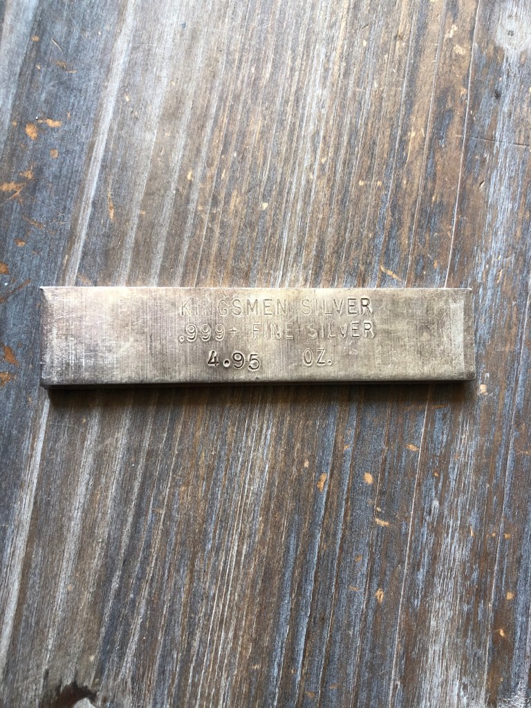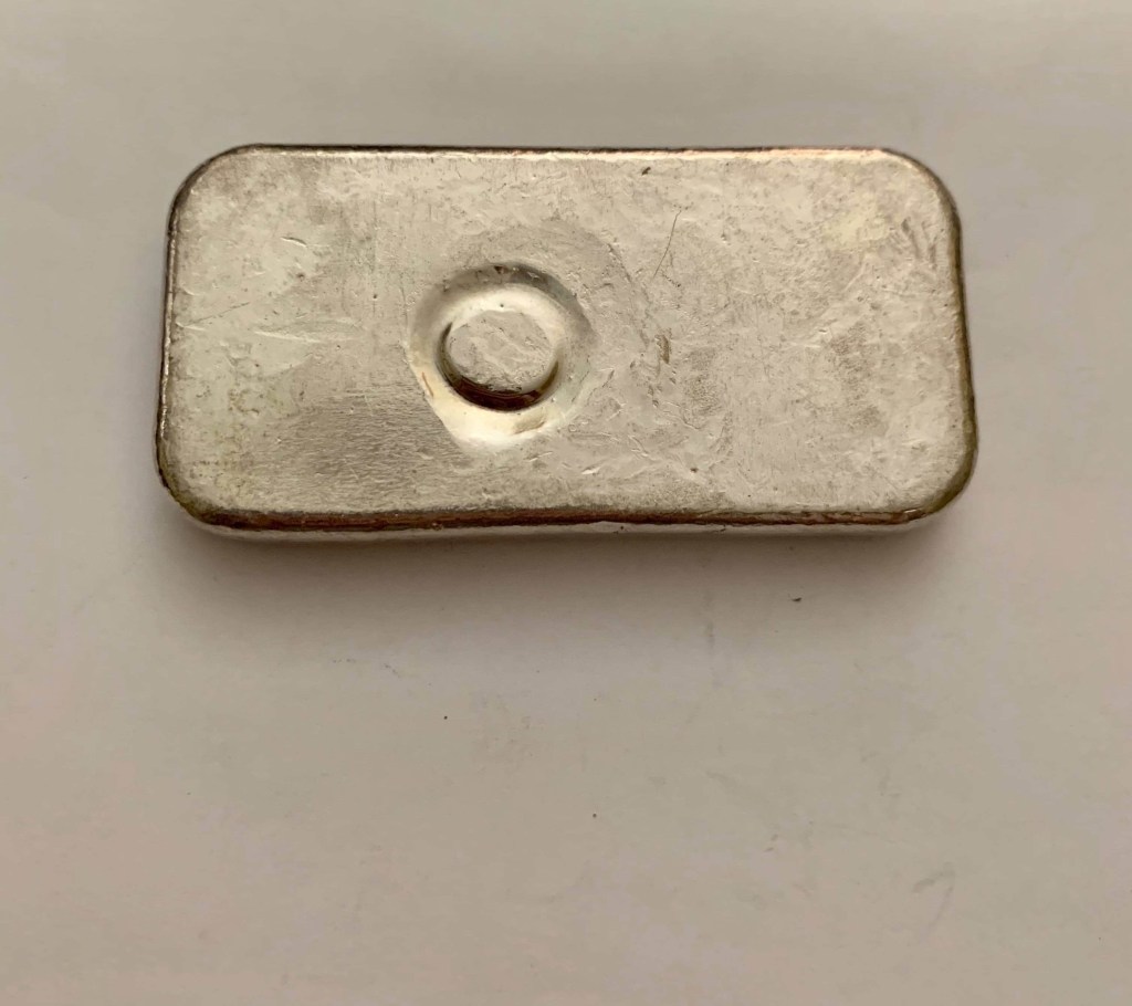 10 oz class Kingsmen, very rare counter-stamp.This Pure Silver was a commonly used mold, but very few Kingsman examples exist. I’ve seen one other.Bar #1637. Extruded example in same variety as Swiss of America an Rocky Mountain Mint (RMM).Reverse of extruded.