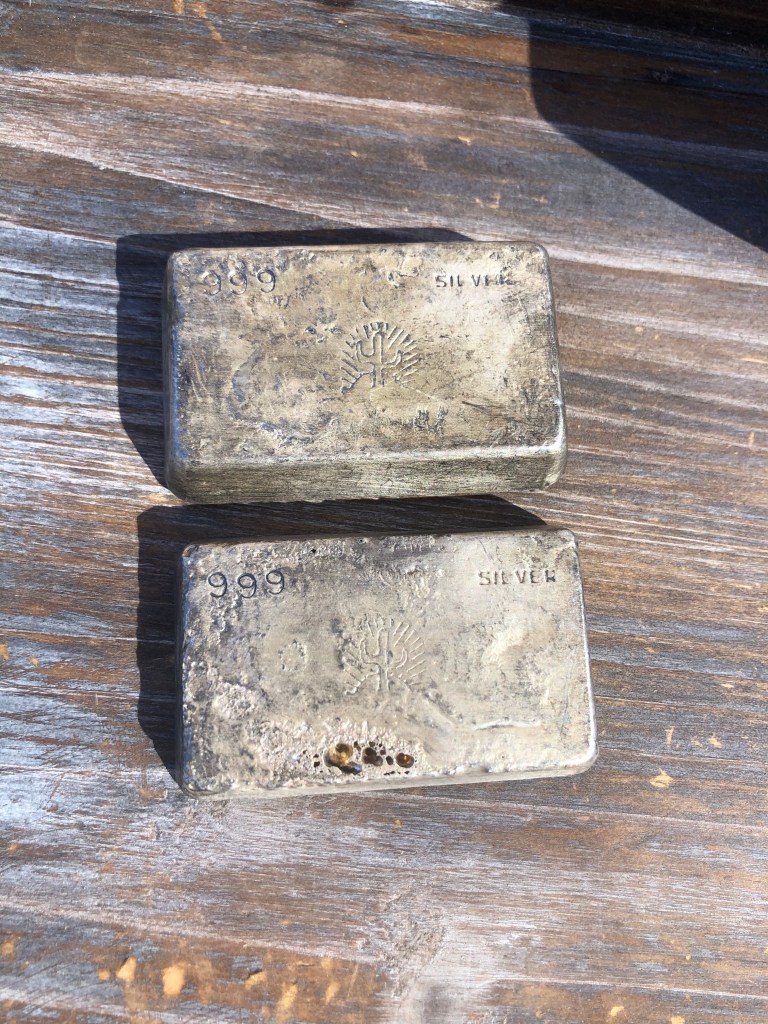 Incredible pieces that have aged like a fine wine. Top bar is 10.28 troy oz and bottom bar is 7.69 troy oz. Look at the bubbling on the bottom ingot. Incredible. Gold toning inside.Top ingot is thicker. It appears same mold used, but more silver poured on the top ingot, obviously.Assay paper from 1984. So cool!