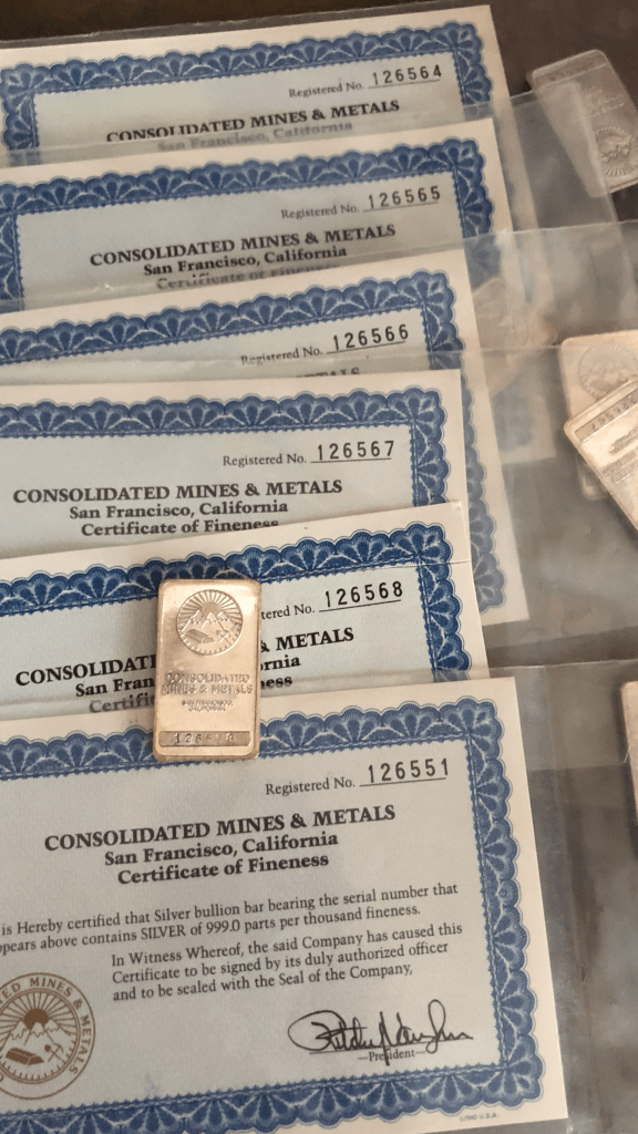 The 1 oz pressed Consolidated Mines and Metals are very scarce, even with the estimated 1,000 made, there are very few survivors. I’m proud to own a set of 5 sequential plus a 6th piece that’s not part of the set. See pics below. They came with assay paper, which I have for all of them.