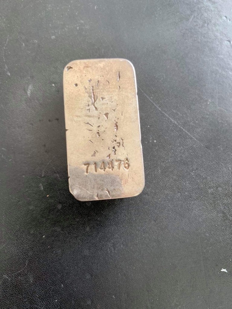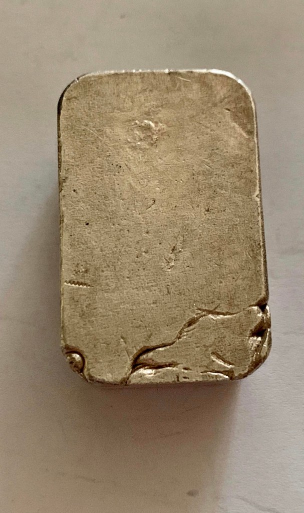 Bahamian Refining Company, interesting bread loaf style with serial/lot number stamped top center. Not much is known about them, other than they were an incorporated company in Arizona, operating in the early 1980s. I have a few interesting 1 oz pieces that I’ll post in a blog on “silver smalls.”