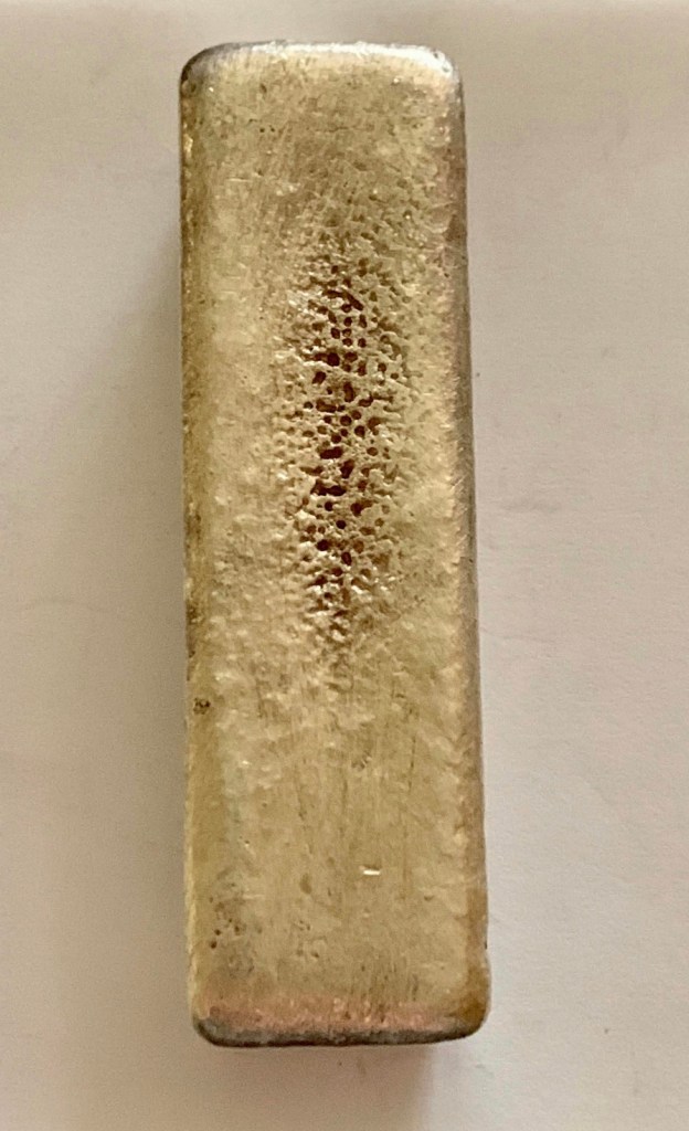 5.30 oz odd weight.Nice clean reverse. Nice pour character at top of ingot.