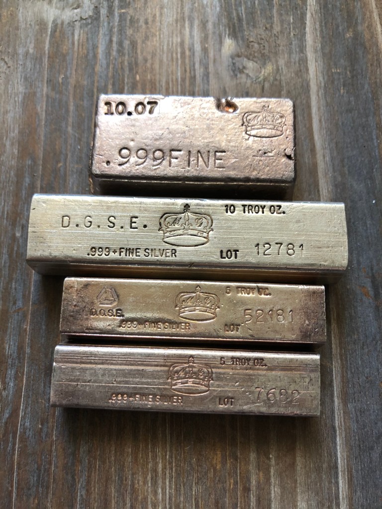 When I started my vintage journey about 6 years back, California Crown Mint was among the early vintage pieces I acquired. Otherwise knows as CCM, these ingots were produced in higher volume, but disappeared during the “Great Melt.” Their commonly found in kit kat style, predominately 5 and 10 oz, but they also did 25-100 oz which are less commonly found these days. They have a great hallmark of a crown with the initials M and G in the crown. For those who don’t know, these are the initials of the former President of CCM, Michael Graham. The company began in 1980 and put out a lot of bars their first few years. Not much information can be found after this period of time. One of my favorite CCM pieces is an ultra rare poured 10 oz class bar. I’ve come across 3 in all my time collecting. CCM also made bars for various resellers as you can see by the example below, DGSE (Dallas Gold and Silver Exchange). The serial number also happens to be the date the ingots were made, so in the case of the 10 oz bar pictured, the #12781 signifies December 7th, 1981. Pretty cool.