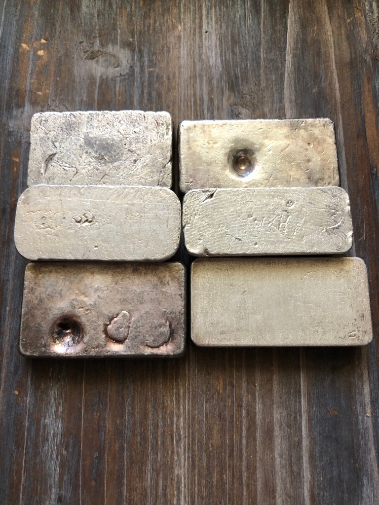 10 oz class x 6. Nice assortment. I’ll elaborate a bit below on these.The character and color on the Capital Metals ingot is tough to beat. The reverse of the Cascade Refining also nice. Love these air bubble marks that are so common on certain pieces.